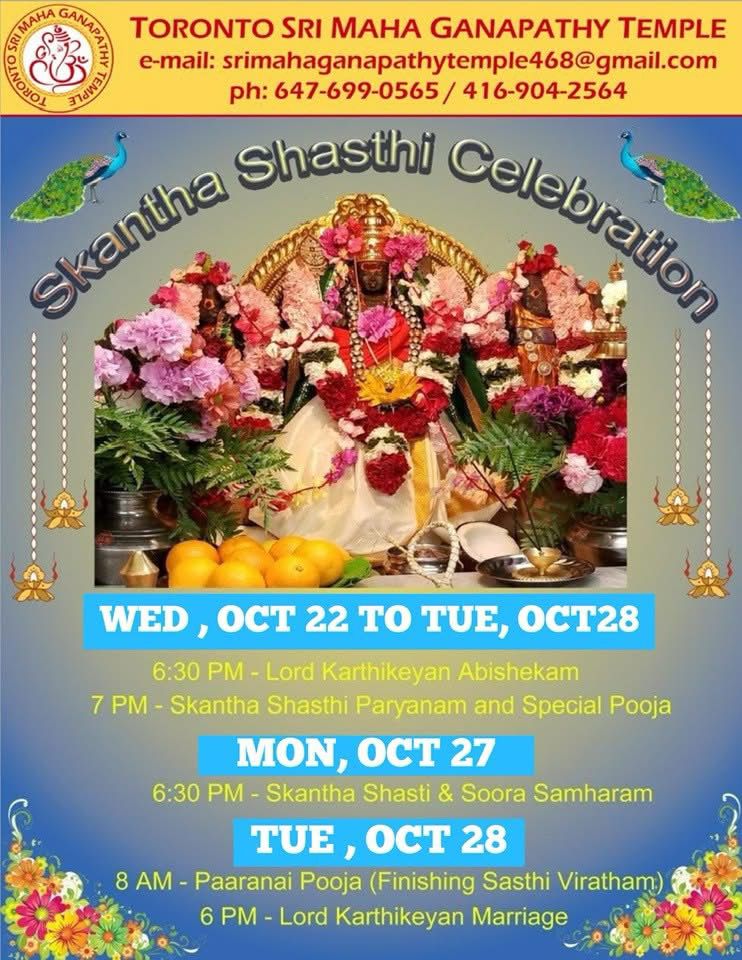 6:30 PM - Lord Karthikeyan Abishekam 7 PM - Skantha Shashti Paryanam and Special Pooja |